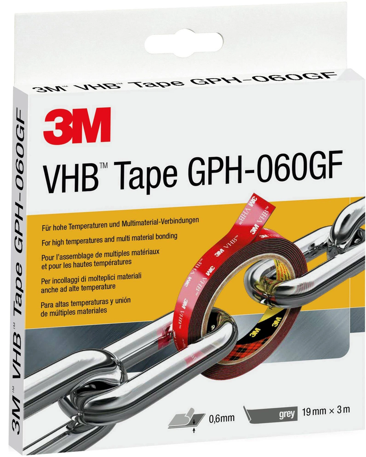 3M VHB GPH är en grå formbar akrylfoamtejp. Tejpens höga temperaturbeständighet gör den perfekt för applikationer där sammanfogning innan pulverlacksprocessen är ett önskemål. Den fäster mot många olika ytor så att du kan sammanfoga olika materialtyper med hög- till medelhög ytenergi inklusive många metaller (t ex rostfritt stål) och plaster (t ex PA, PMMA, ABS). Tejpen är tillgänglig i tre olika tjocklekar och har en röd silikoniserad polyetenfilmliner med 3M logotyp.