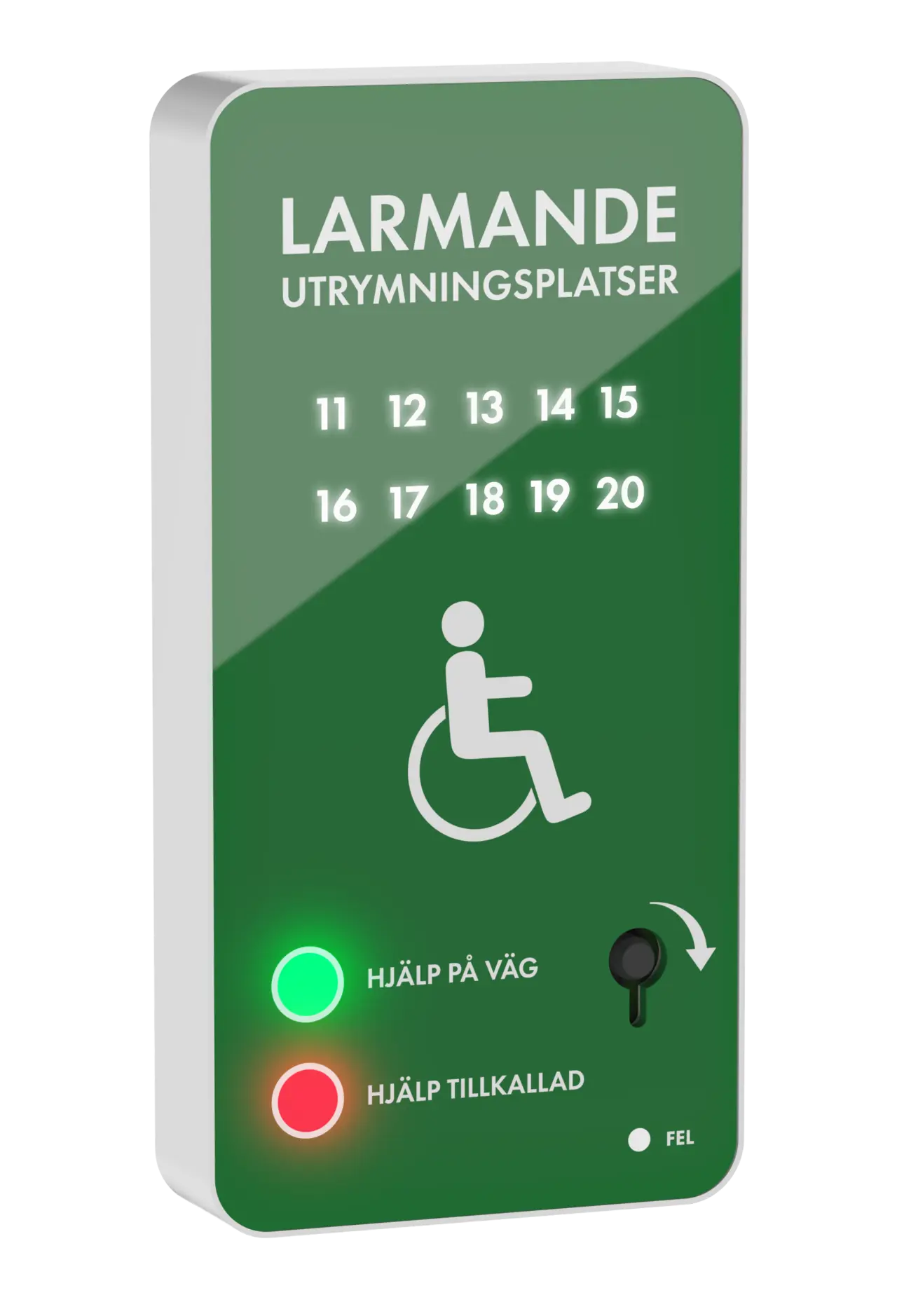 UP-MIDI-seriens larmpanel 11-20 är utformad för att passa in i entrémiljöer utan att bli förbisedd eller förväxlad. Den gröna färgen och det tydliga meddelandet fångar uppmärksamhet. Inkommande larm visas med blinkande siffror och en återkommande ljudsignal. Larm kvitteras med brandkårsnyckel, vilket samtidigt signalerar till den nödställde att hjälp är på väg. Panelen hanterar upp till 10 övervakade nödstationer, där varje fel visas med en egen indikering. Larmpanelen och nödstationerna får ström och kommunikation från distributionsenheten UP-MIDI-DE, som även övervakar systemet. Systemet tillåts vara inaktiverat tills dess att brandlarmet lösts ut, om så önskas.