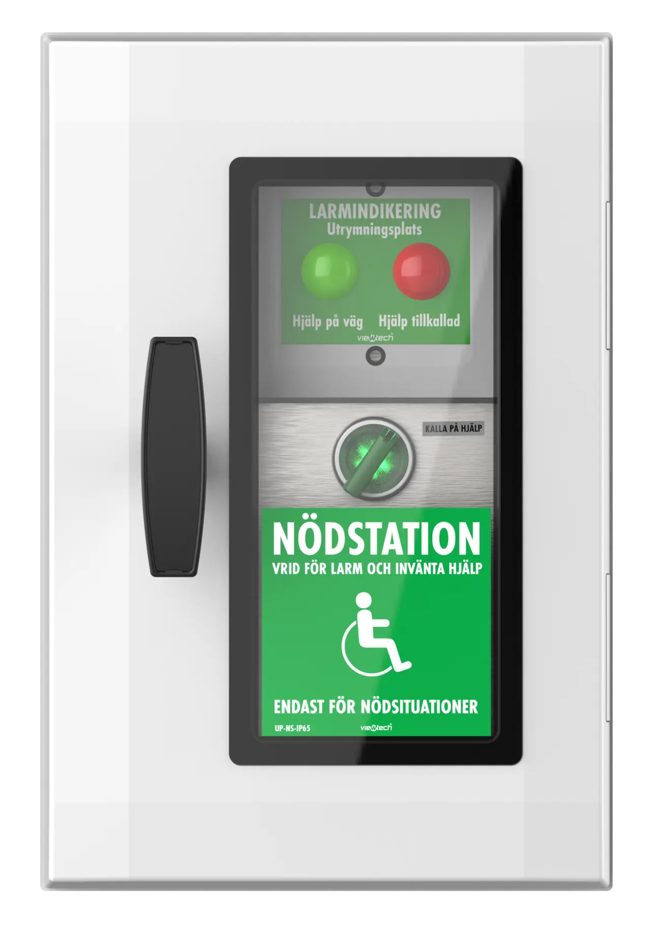 Komplett nödstation för utrymningsplats i IP65 utförande. Enheten består av ett IP65 tätat skåp i skyddsklass IK10 med ett Smidigt T-handtag som alla kan öppna. Inuti skåpet sitter en indikeringsenhet för ”hjälp tillkallad” som lyser rött när den nödstälde vrider på vredet under enheten. Även vredet tänds med en grön LED för att visa att den är aktiverad. När räddningstjänsten kvitterar larmet vid angreppsvägen så tänds lampan ”hjälp är på väg”. Enheten återställs genom att vrida tillbaka vredet. På rutan finns en tydlig informationsdekal.