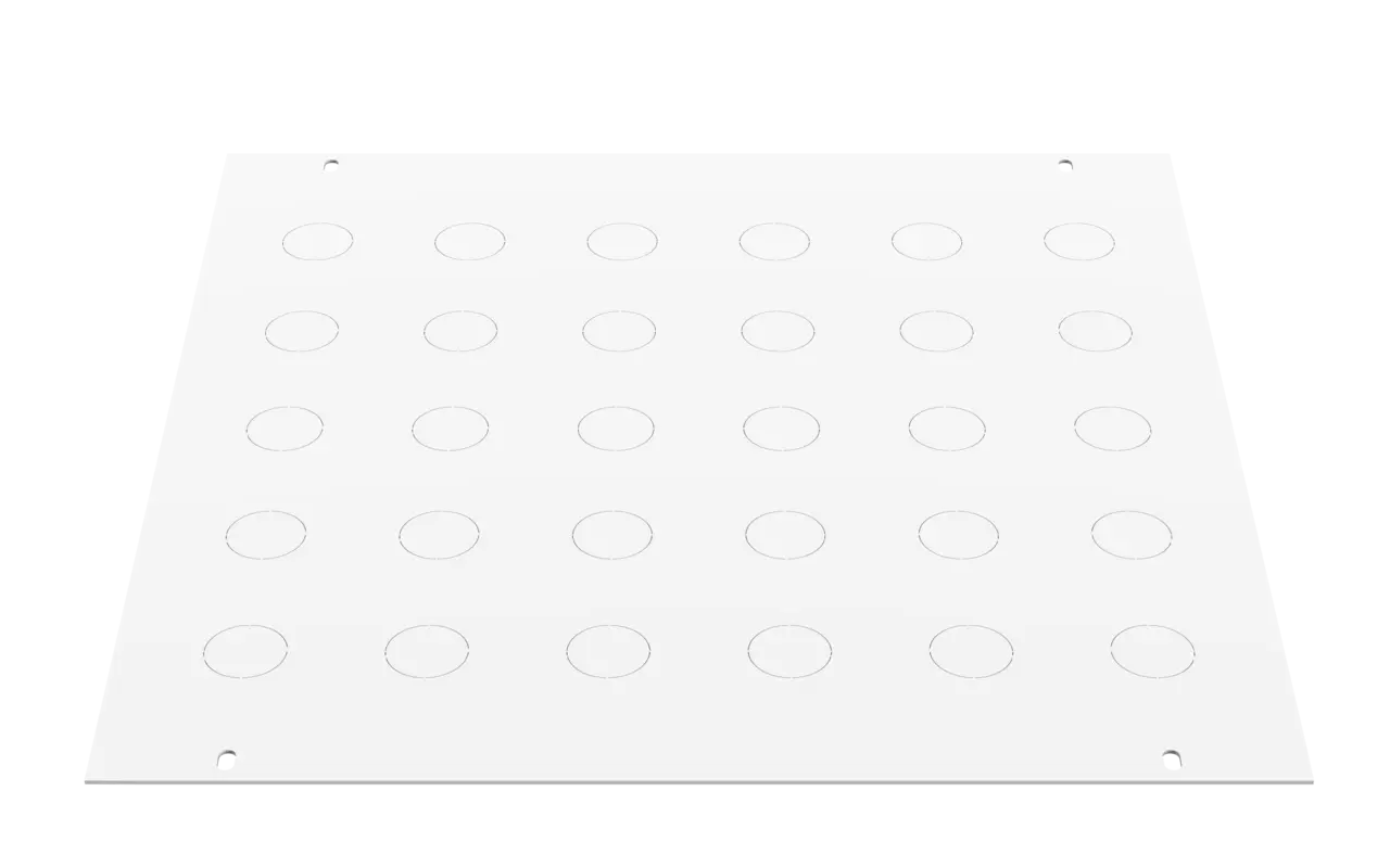 Montagesplåt till modulskåpet MS-30. Denna panel har 30 knock-out hål för 22.5 mm manöverenheter såsom knappar, vred, nödbrytare etc från BACO. Knappar, lampor och vred byggs sedan enligt önskad funktion med kontaktblock av typen NO/NC. Plåten är vitlackerad och hjälper dig till en helt egen lösning efter egna krav.