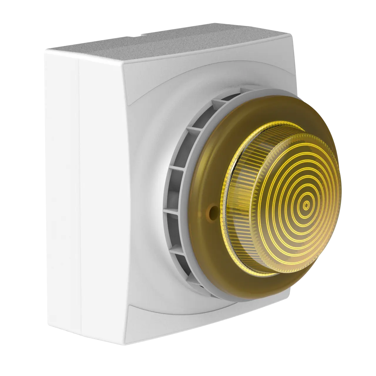 Detta är ett kombinerat blixtljus / siren med vit kapsling och orange lins samt 32 valbara toner och levereras med en låg ram som standard. Den kan fällas in i dosa eller monteras med IP67-klassad backbox som beställs som tillbehör. Med en relativt låg strömförbrukning och ett brett spänningsintervall lämpar sig detta blixtljus till flertalet applikationer.